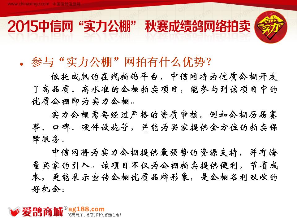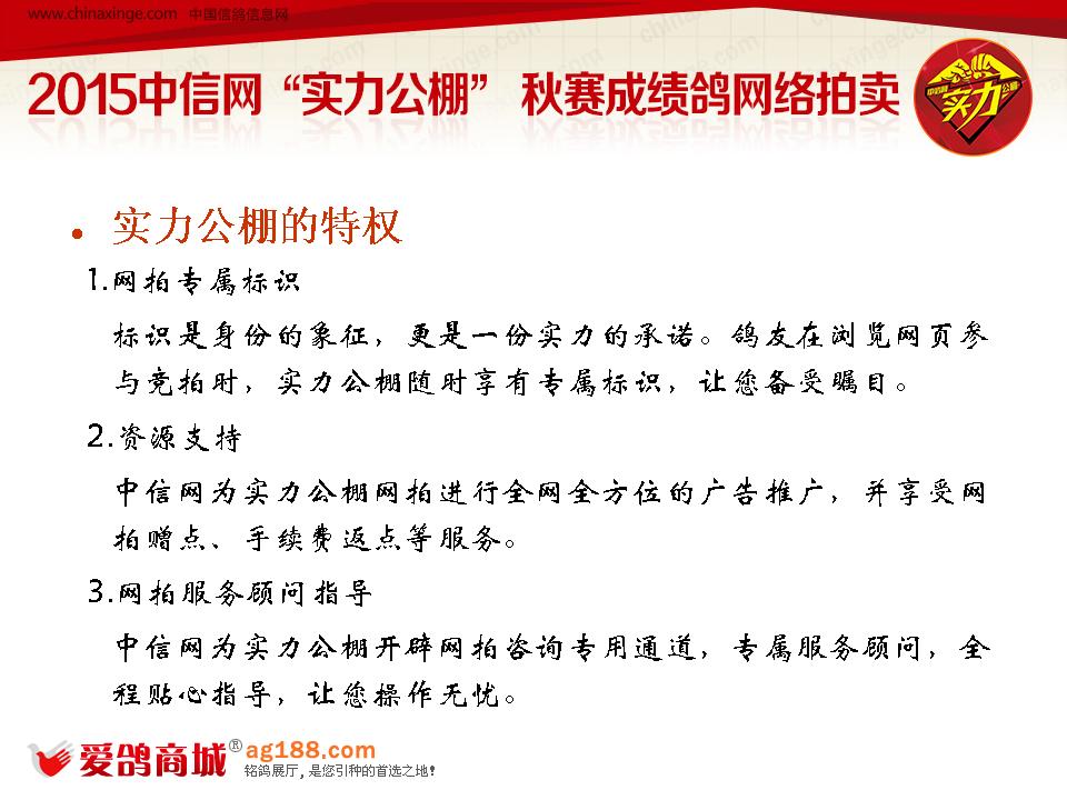 3.1 全方位的推广。“实力公棚”将享受中信网全站全方位的推广,不仅仅有首页信息宣传、新闻报道、二级栏目焦点发布,鸽友通消息推送、手机APP推广等;
