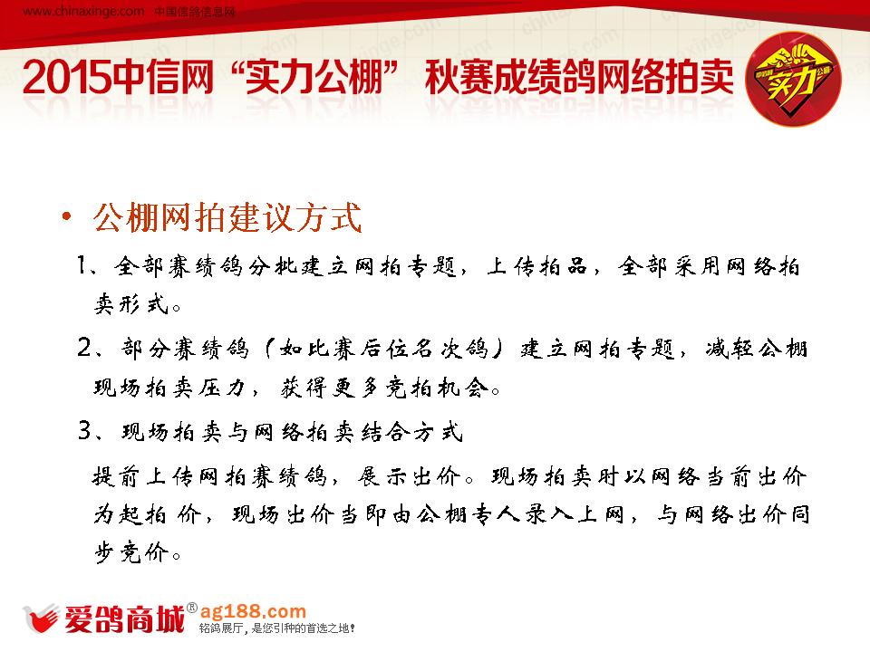 2.3 现场拍卖与网络拍卖结合方式。提前上传网拍赛绩鸽,展示出价。现场拍卖时以网络当前出价为起拍价,现场出价后当即由公棚专人录入上网,与网络出价同步竞价。