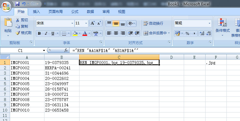 注意:1、A列赛鸽照片与B列的环号要一一对应;2、F列第一格一定要输入原图片的后缀名,输入的命令字段不要错:="REN "&A1&F$1&" "&B1&F$1&""